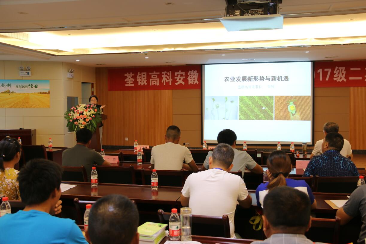 ??? 2018年7月19日,由安徽省農委主辦、荃銀高科承辦的安徽現代青年農場主培訓2017級第二期培訓活動在公司六樓多功能廳展開。安徽荃銀高科董事長張琴、營銷總監王玉林,培訓班總教務長楊惠成老師,安徽張海銀基金會秘書長張彤,及來自全省各地的100多位從事種植業的農場主學員參加了培訓。