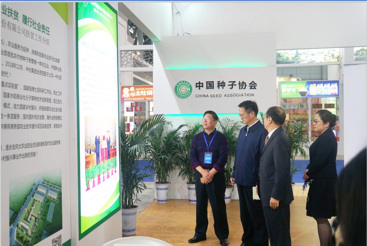 ??? 開幕式后,民政部詹成付副部長參觀了中國種子協會扶貧展廳,并在荃銀高科展板前駐足觀看,聽取荃銀高科開展扶貧工作匯報,并給予高度評價,中國種子協會鄧光聯副會長陪同巡展。